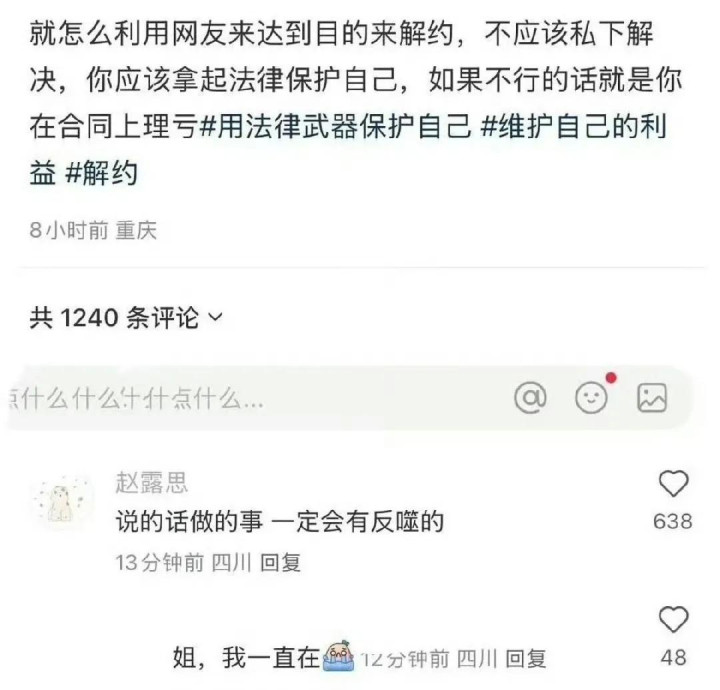 很快,赵露思被网友质疑是利用舆论,利用网友想和公司解约但赵露思发文否认,称“说的话做的事,一定会有反噬的”,一度再上热搜。