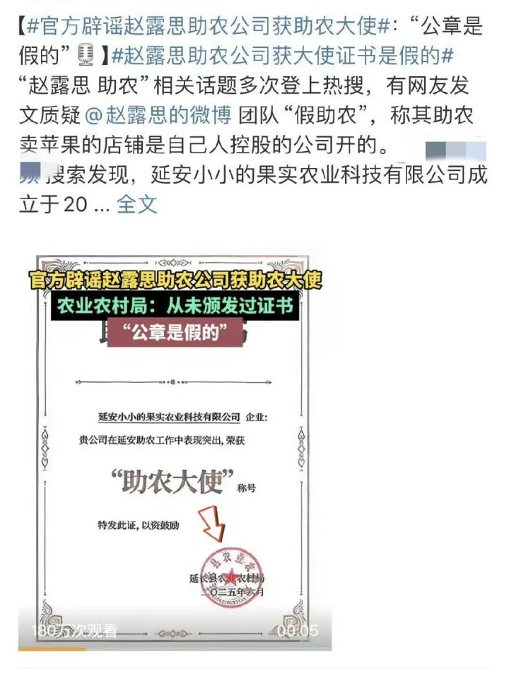 其闺蜜关联公司发布的“助农大使”证书也被官方辟谣是假的。