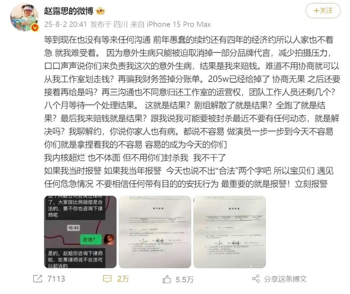 8月2日,赵露思突然发文,点名了银河酷娱公司,紧接着第二天,赵露思发文控诉公司从自己工作室账户划走205万用于支付违约金,并且还不归还工作室运营权。